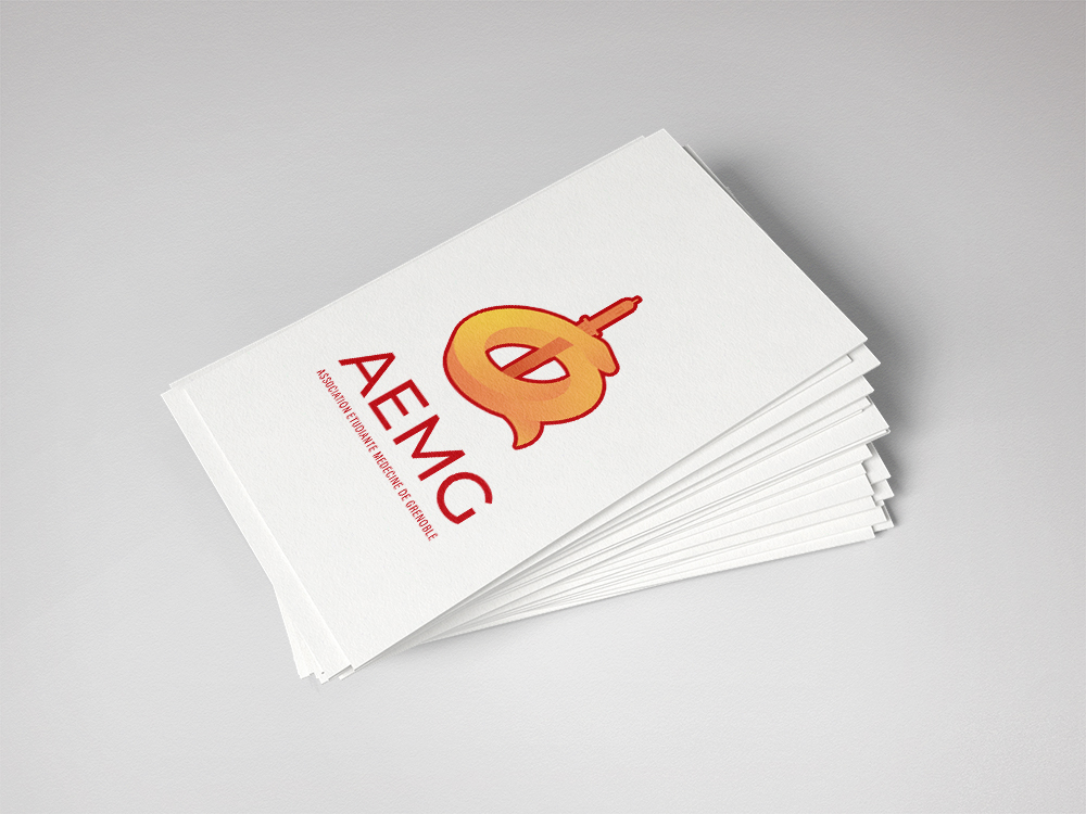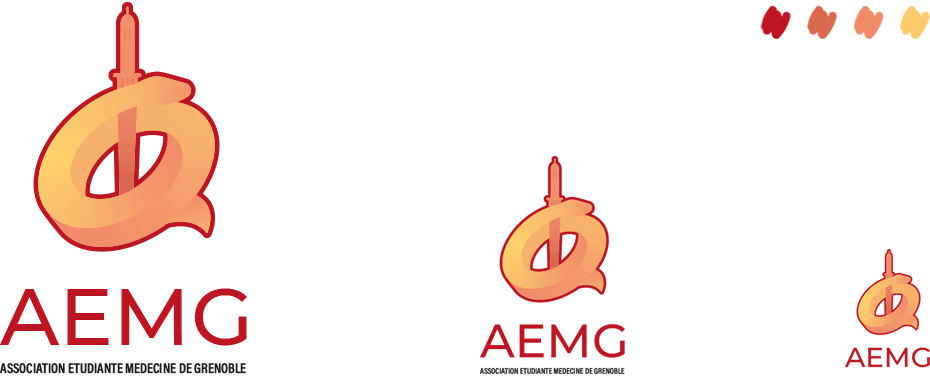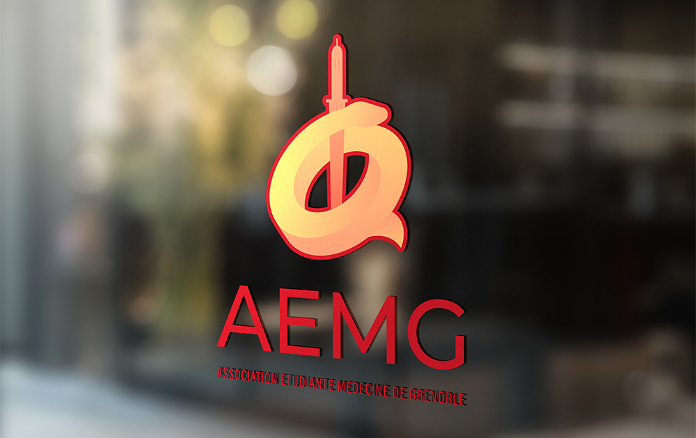 L'AEMG organise toutes les activité périscolaires de la filière médecine de Grenoble (événements, concours, aides, accompagnements...). L'éternel caducé a été décliné en y mêlant la Tour Perret, monument iconique de Grenoble. Des couleurs chaudes rappelant un coucher de soleil ont été choisies pour contraster avec un fond blanc uni, donnant au logo un bon impact esthétique.