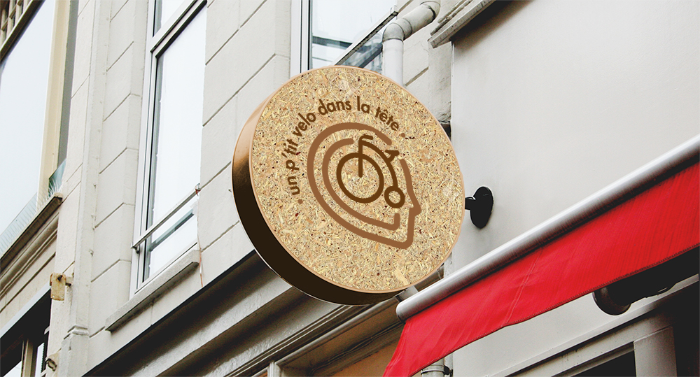 L'association " Un p'tit vélo dans la tête " restaure des vélos cassés pour les vendre à des prix attractifs, et propose un entretien et des révisions de votre vélo à bas coût. Le vélo, principal moyen de transport urbain éco-reponsable, est en plein essor dans la ville de Grenoble à la mairie écologiste. C'est ce rapport privilégié au respect de l'environnement que j'ai choisi de mettre en avant : la texture de bois aggloméré évoque la notion de recyclage, alors que les tons vert et marron sont des couleurs qu'on voit naturellement dans la nature.