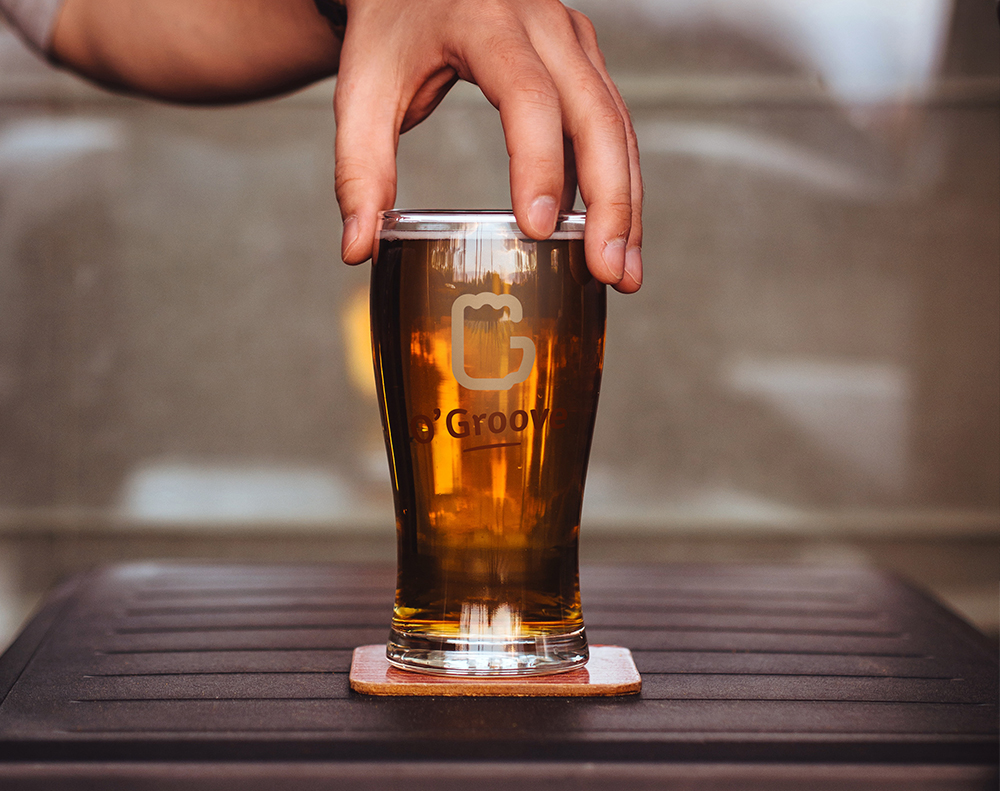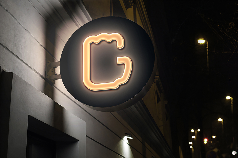 Pour mettre en lumière l'aspect "groovy" et dansant de cette diversité vivante, une typographie sans empattement, arquée et renversée, apporte un aspect contemporain, un mouvement au tout. Le pictogramme quant à lui est le parfait amalgamme d'un "G" et d'une pinte de bière. Enfin, des tons chauds mettent à l'honneur les couleurs du fameux nectar de houblon fermenté, point d'orgue du commerce.